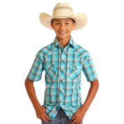 Rock & Roll Boy's Short Sleeve Plaid Dobby Snap Shirt- Bright Turquoise
