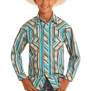 Rock & Roll Boy's Long Sleeve Aztec Stripe Print Snap - Bright Turquoise