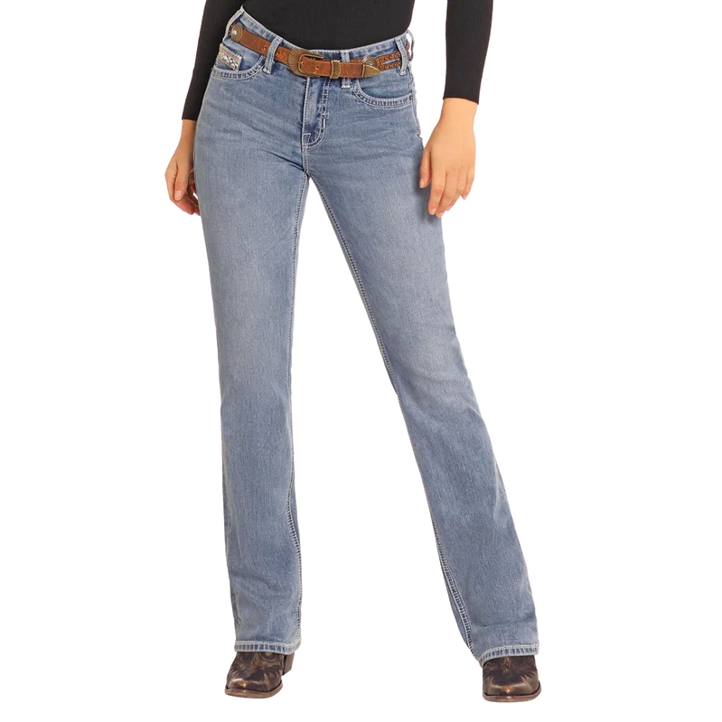 Rock & Roll Women's Mid Rise Steer Embroidered Boot Cut Jeans- Medium Wash