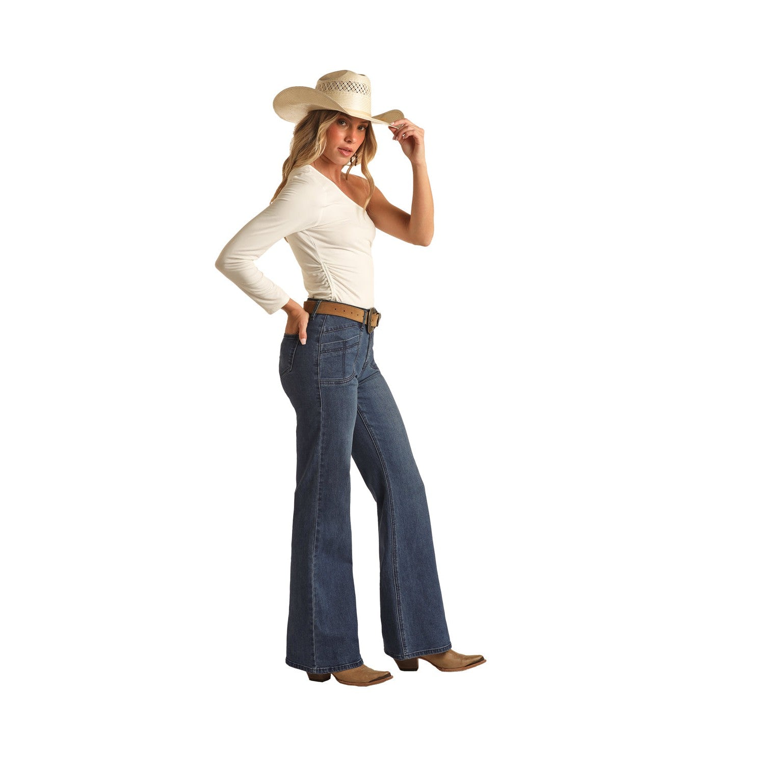 Rock & Roll Women's Pocket Detail Wide Leg Jeans - Medium Wash