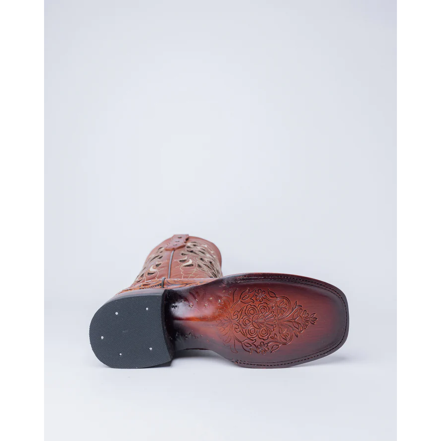- Tooled leather detail on foot
