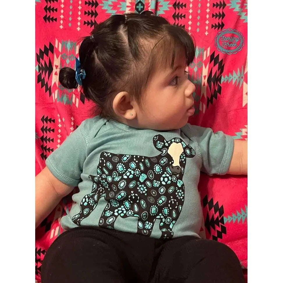 - Featuring a turquoise background and a cute steer adorned with Conchos, this onesie is both stylish and comfortable