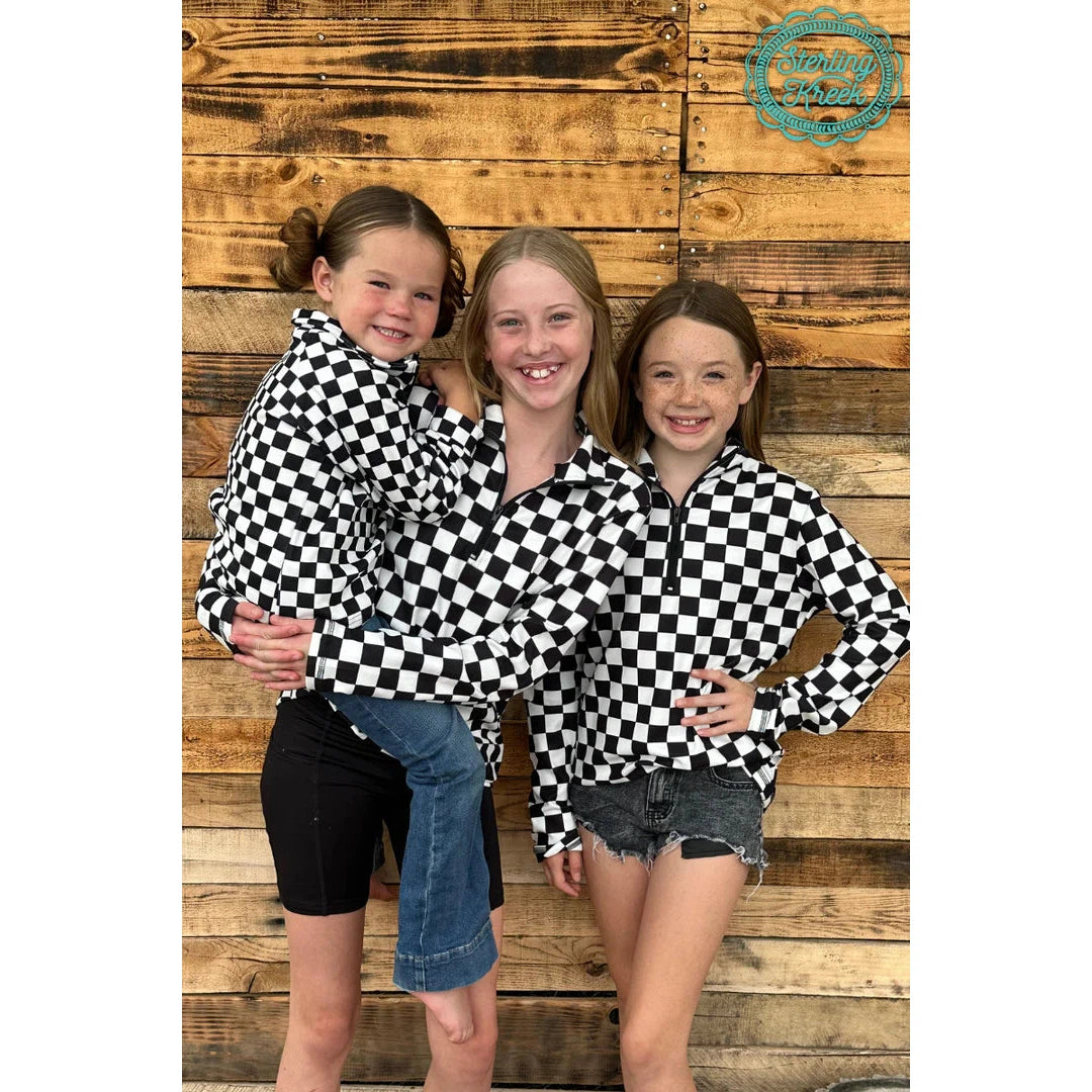 - This kids pullover features a trendy black and white checkered design and a convenient quarter zip