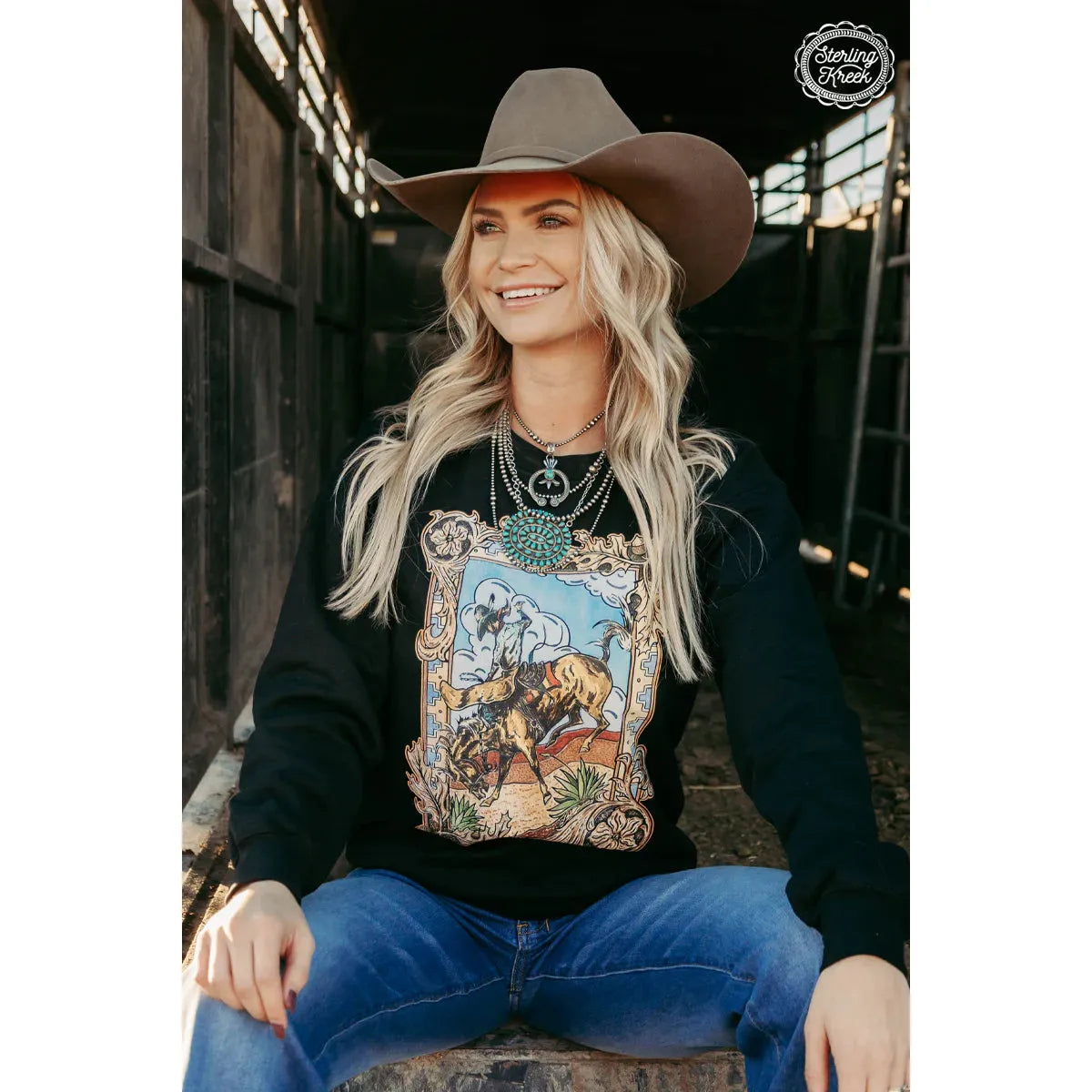 - Keep warm and look wild with this black sweatshirt featuring a tooled boarder of a bucking bronc and a classic Western desert background