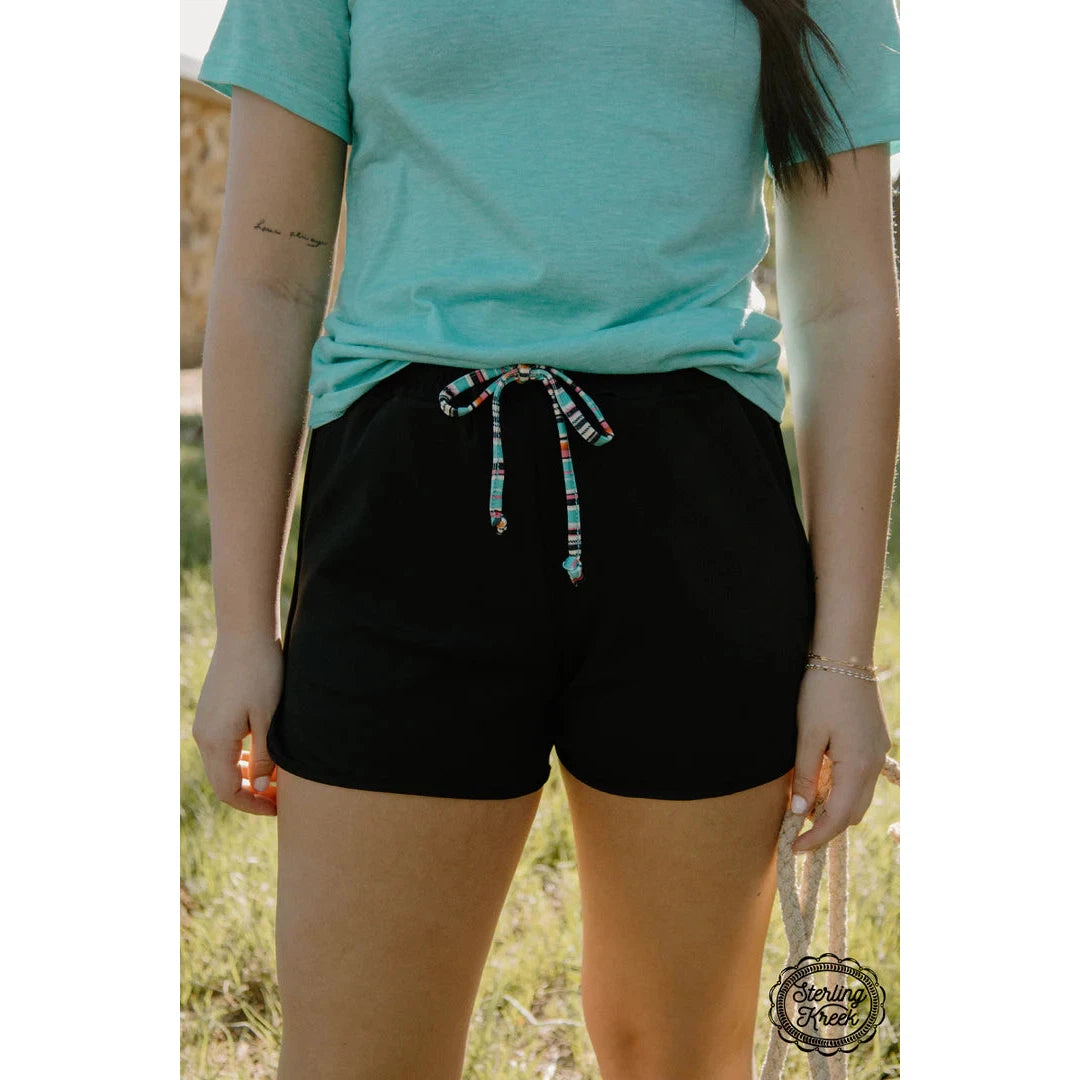 - These solid black shorts feature a playful serape drawstring, adding a touch of flair to your outfit