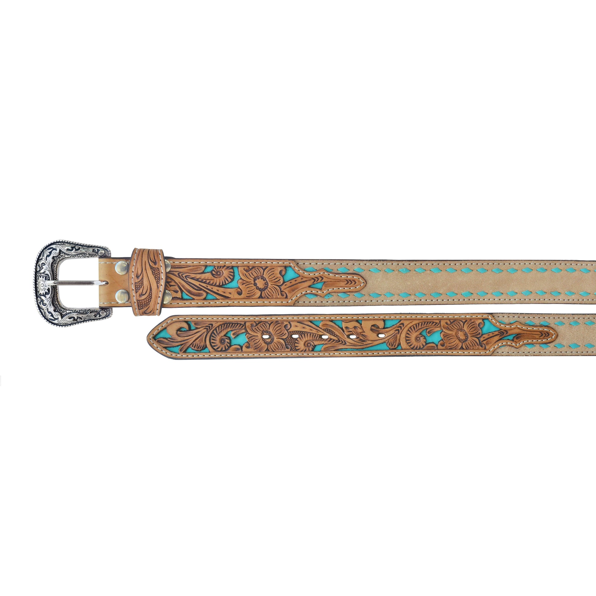 Unisex Western 1-1/2" Floral Tooled Gator Inlay Full-Grain Leather Belt - Tan/Turquoise