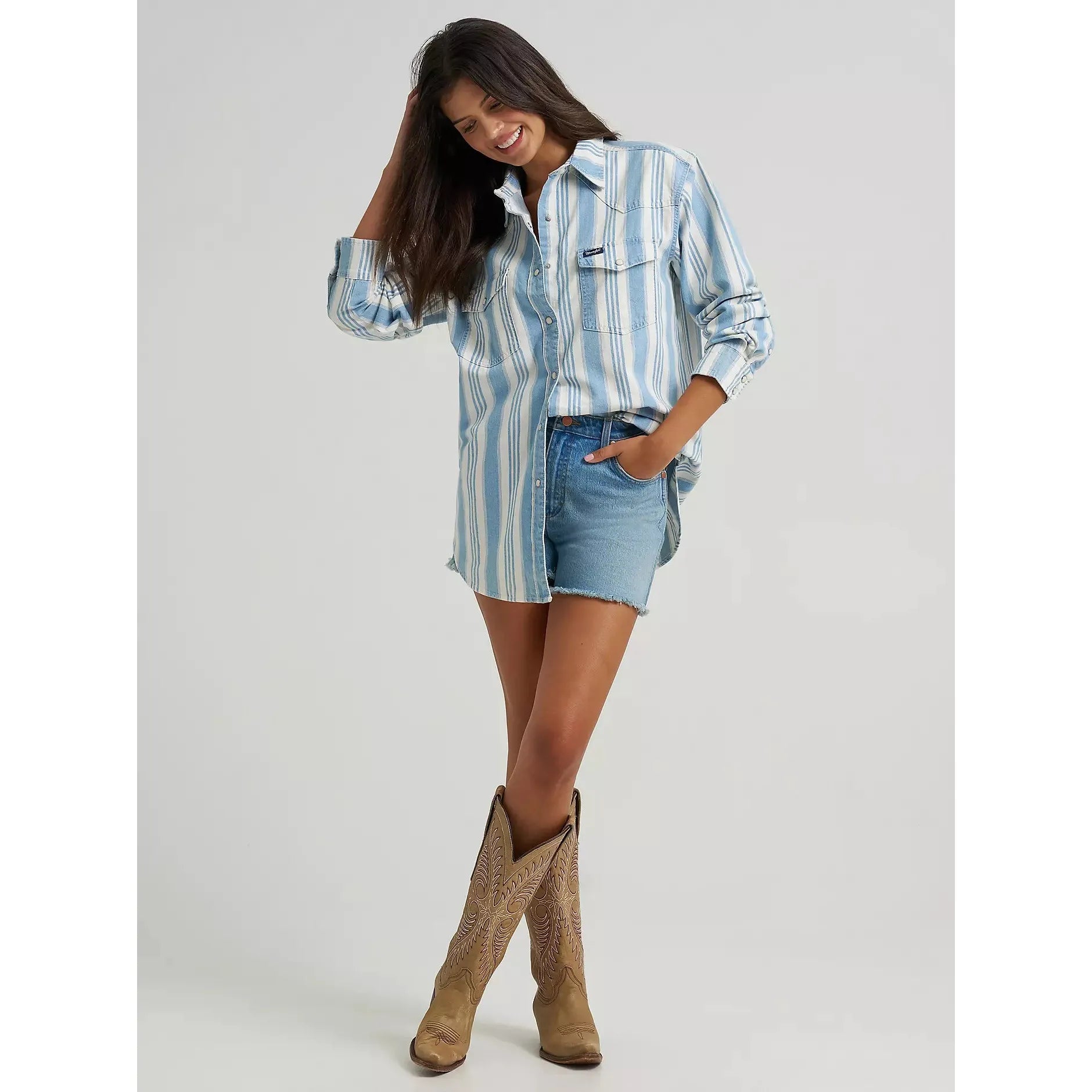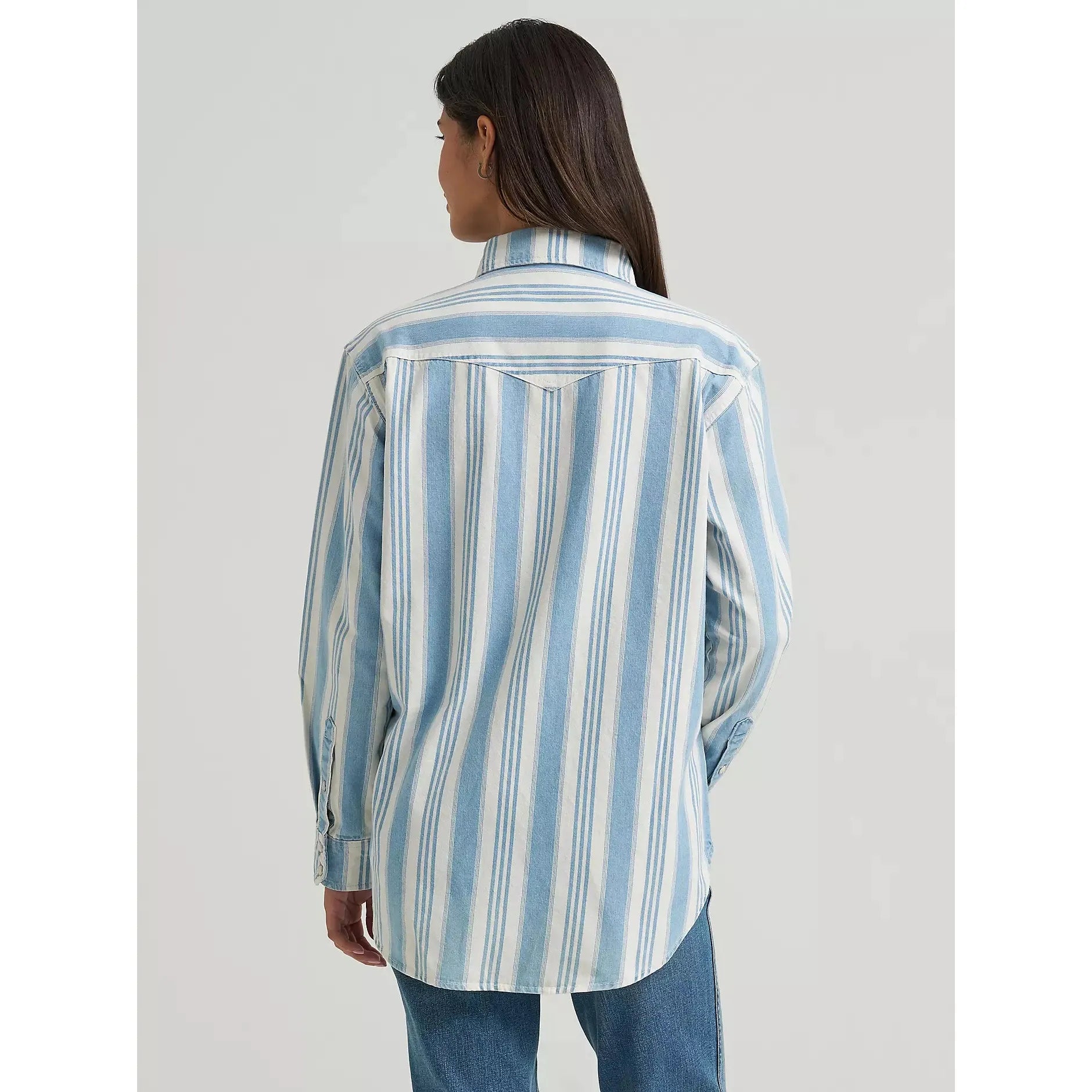 Wrangler Women's Brushpopper Boyfriend Western Stripe Long Sleeve Shirt - Pale Blue