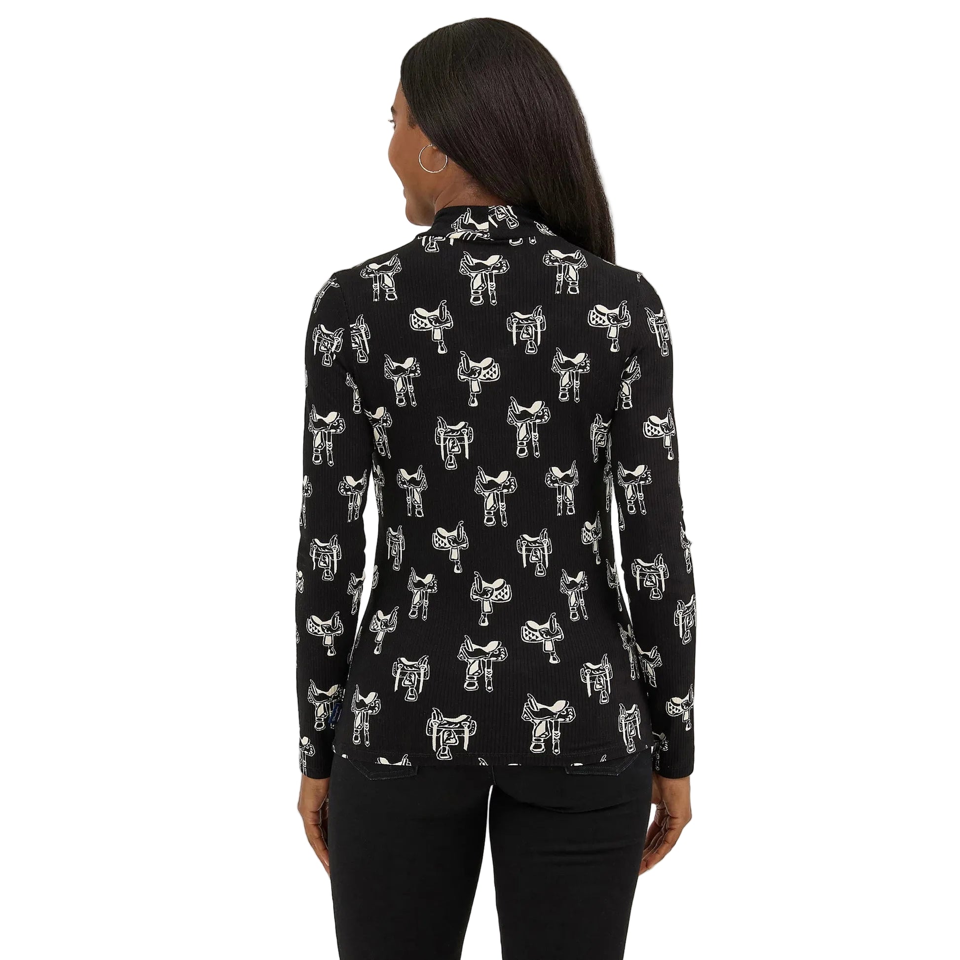 Wrangler Women's Long Sleeve Western Print Mock Neck Tee Shirt - Black